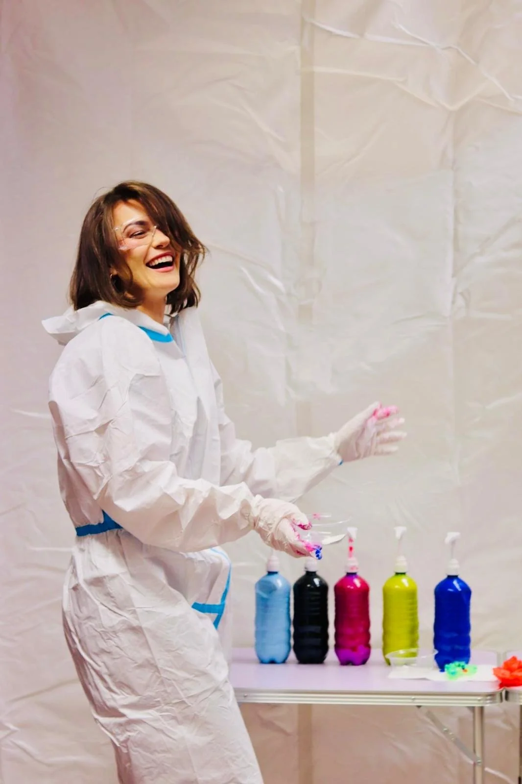 Zieh den Schutzanzug an, schnapp dir einen Pinsel oder Farbbecher und leg los: Spritzen, Werfen, Tropfen – einfach kreativ ausleben.